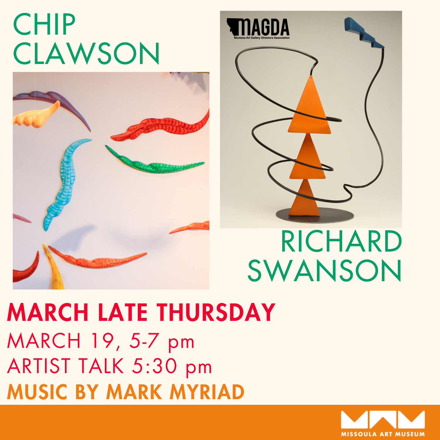 Join the Missoula Art Museum for Third Thursday featuring live music by Mark Myriad and two vibrant exhibitions by Helena artists Chip Clawson and Richard Swanson. This after-hours evening pairs sculpture, sound, and color for a playful and immersive gallery experience, with artist talks starting at 5:30 pm.