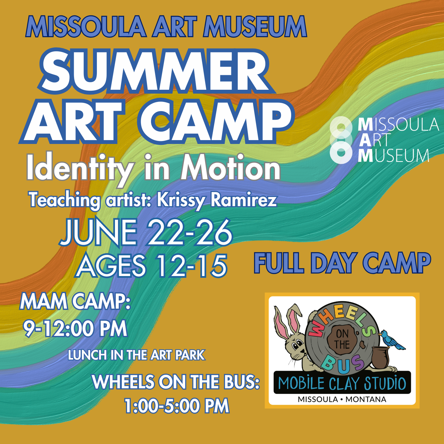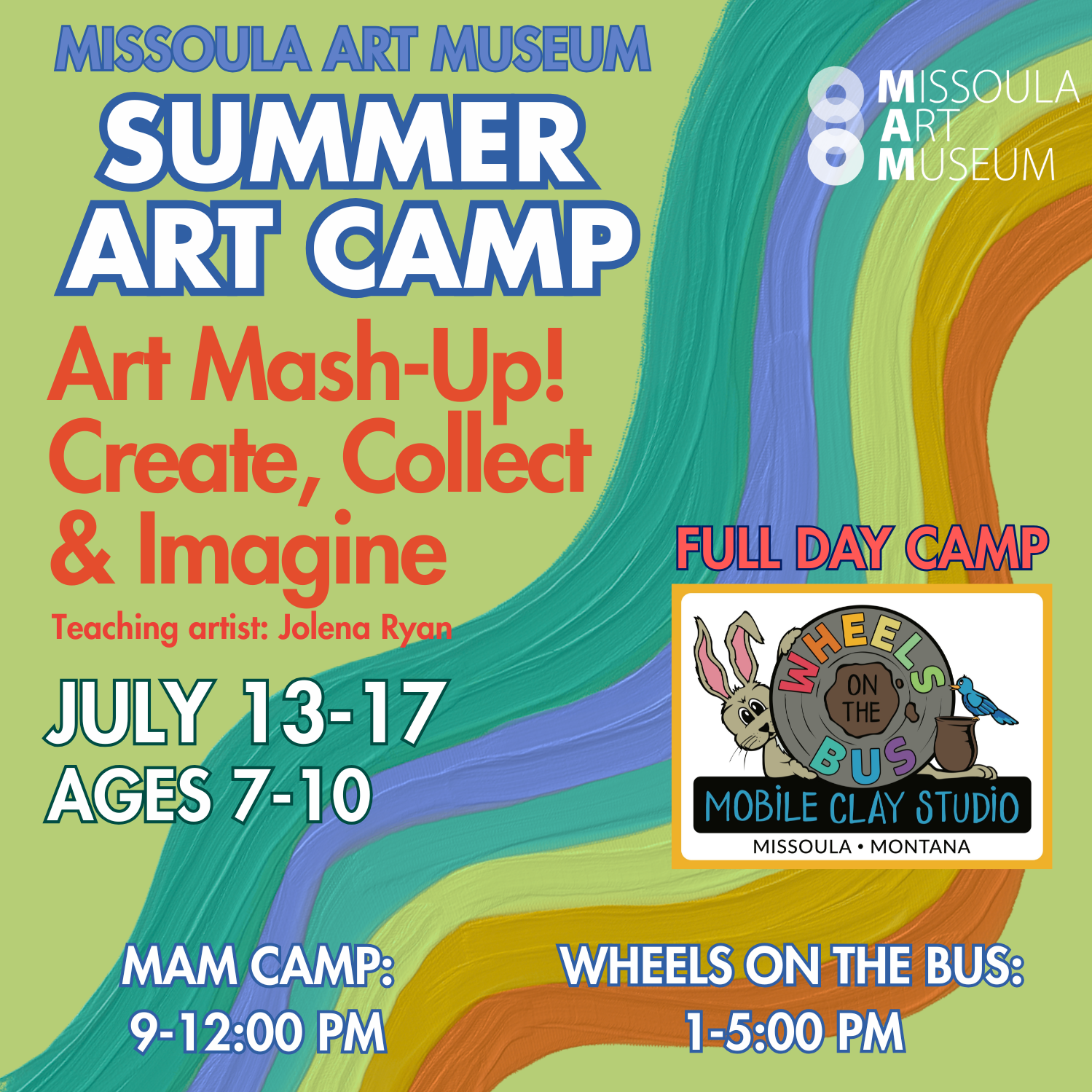 We’re also excited to partner with Wheels on the Bus to offer optional afternoon programming that pairs seamlessly with MAM’s morning camps. During Weeks June 15-19, June 22-26 and July 13-17, MAM camps run in the morning, followed by Wheels on the Bus afternoon camps from 1:00–5:00 PM. A supervised lunch break is provided between sessions by MAM and Wheels on the Bus staff. Campers may register for MAM camps and Wheels on the Bus camps individually, or choose a bundle option to enjoy a full day of art-making!