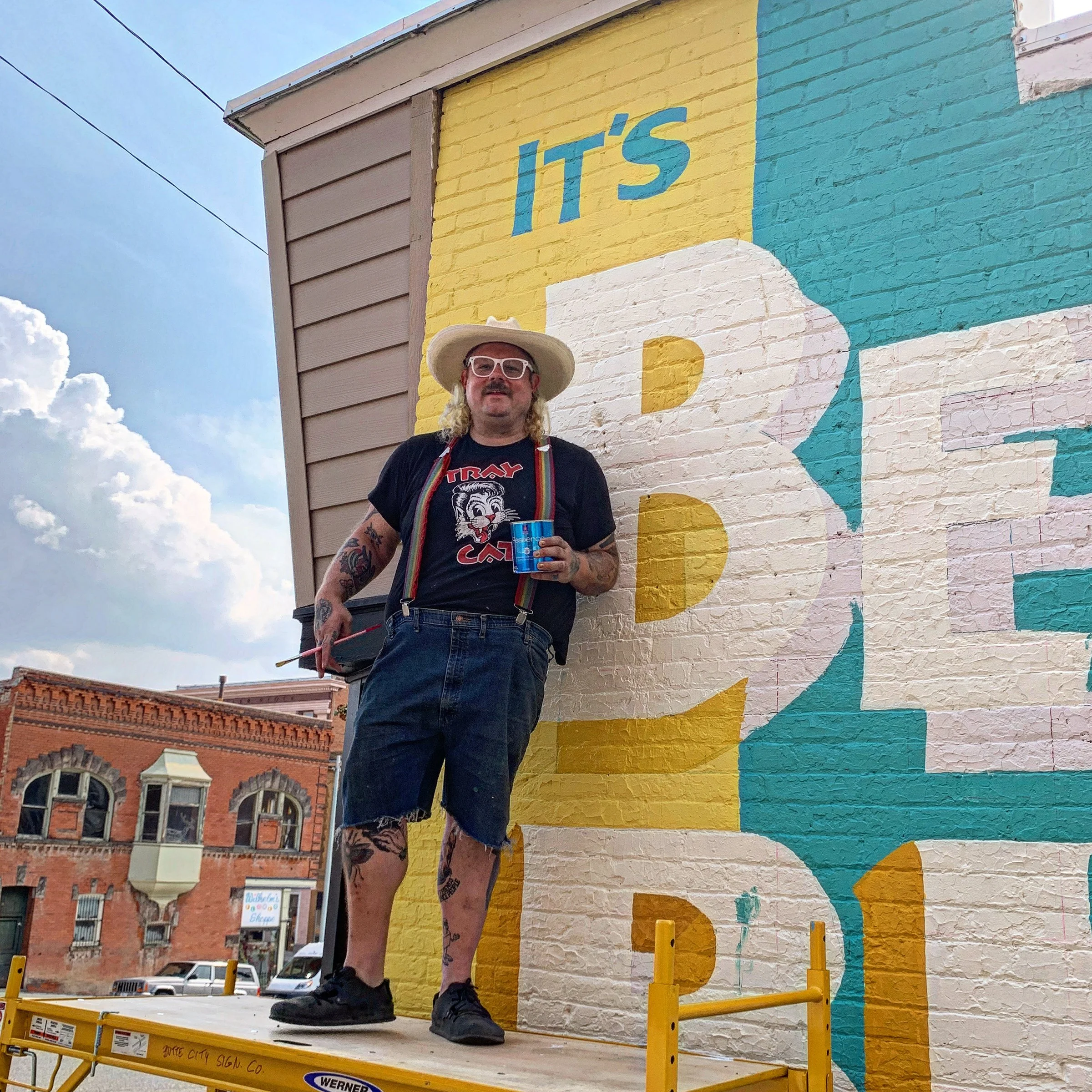 BT Livermore (they/them) is a multi-focus artist from Butte, MT, who has always been creating, something—anything—since childhood. They love to repurpose stuff: prints, paintings, wood, and other functional pieces, and home goods. Most of what Livermore makes focuses on vintage style, typography, found objects, and a humorous message. Livermore's professional skillset includes traditional hand painted lettering and gold leaf work for custom signs, illustration, logo design, as well as screen and letterpress printing. BT also dabbles in woodworking, furniture construction, and restoration. In 2022, Livermore was an OpenAir resident artist at Home Resource and had a solo exhibition at the Arts Chateau in Butte. The exhibition explores the journey one takes to realize various and intersecting, personal identities and truths. In particular, the pathways taken for BT to come out later in life as agender and asexual, and how those interact with other identities such as parent, partner, and artist.