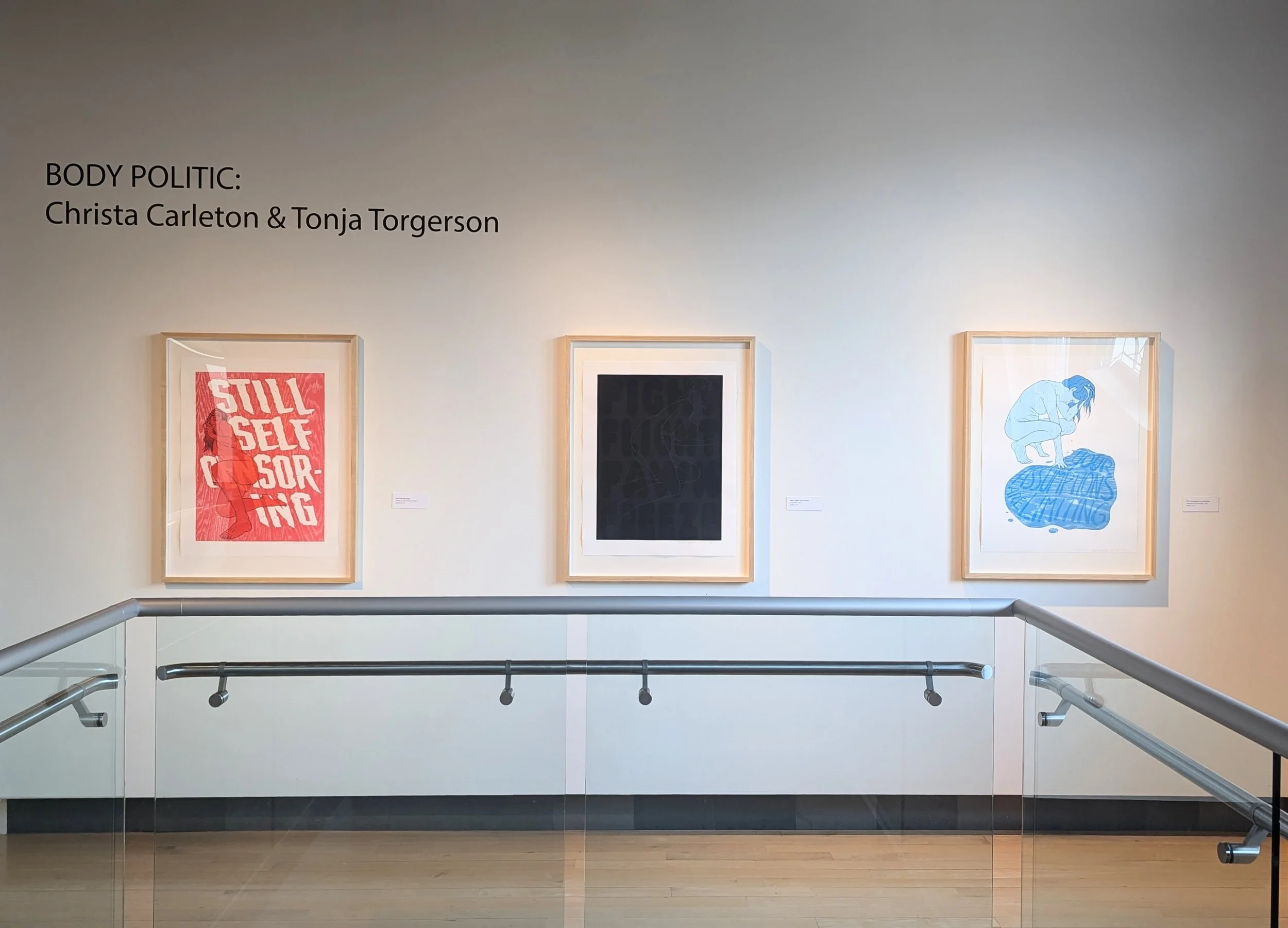 Bodies have always been a point of control, debate, and controversy within our society. Printmakers Christa Carleton and Tonja Torgerson make work to highlight the tumultuous position of the body and gender roles. Their collaborative prints focus on political themes associated with the figurative nude. Using letterpress, screenprint, and woodcut, these prints reference broadsides and use the impact of print-media to destabilize current ideas on gender roles and bodies. Mailing these prints back and forth from Indiana to Montana, the artists have responded to one another and these topics layer by layer, building a dialogue across the country and within each print. Stark, nude figures are combined with bold, aggressive text that challenge the expectations which are put upon them.